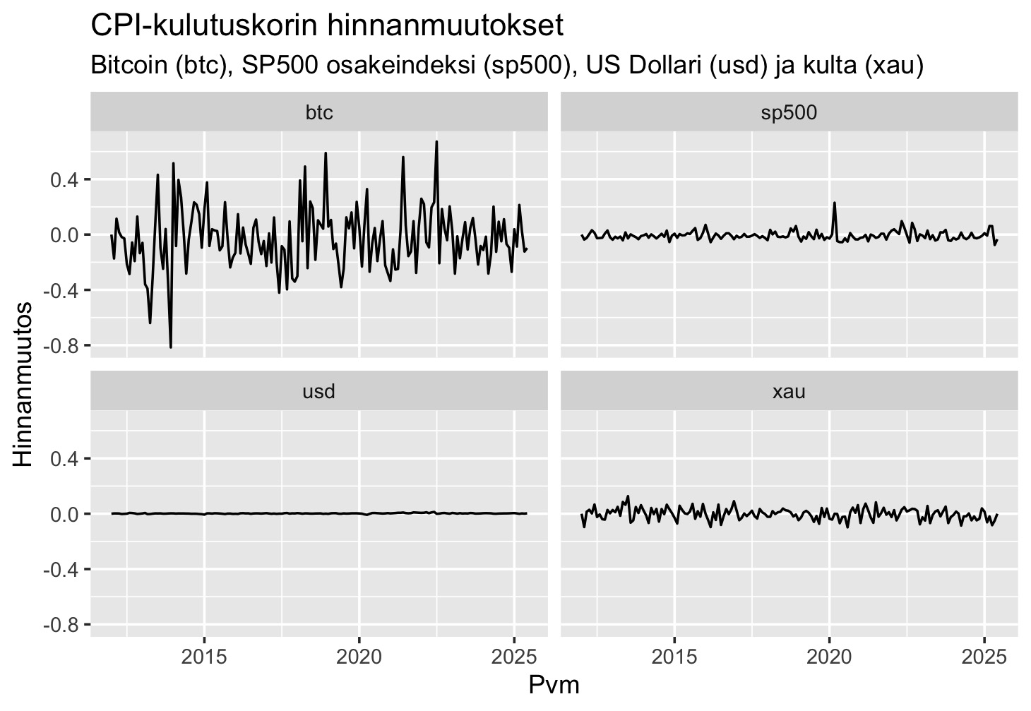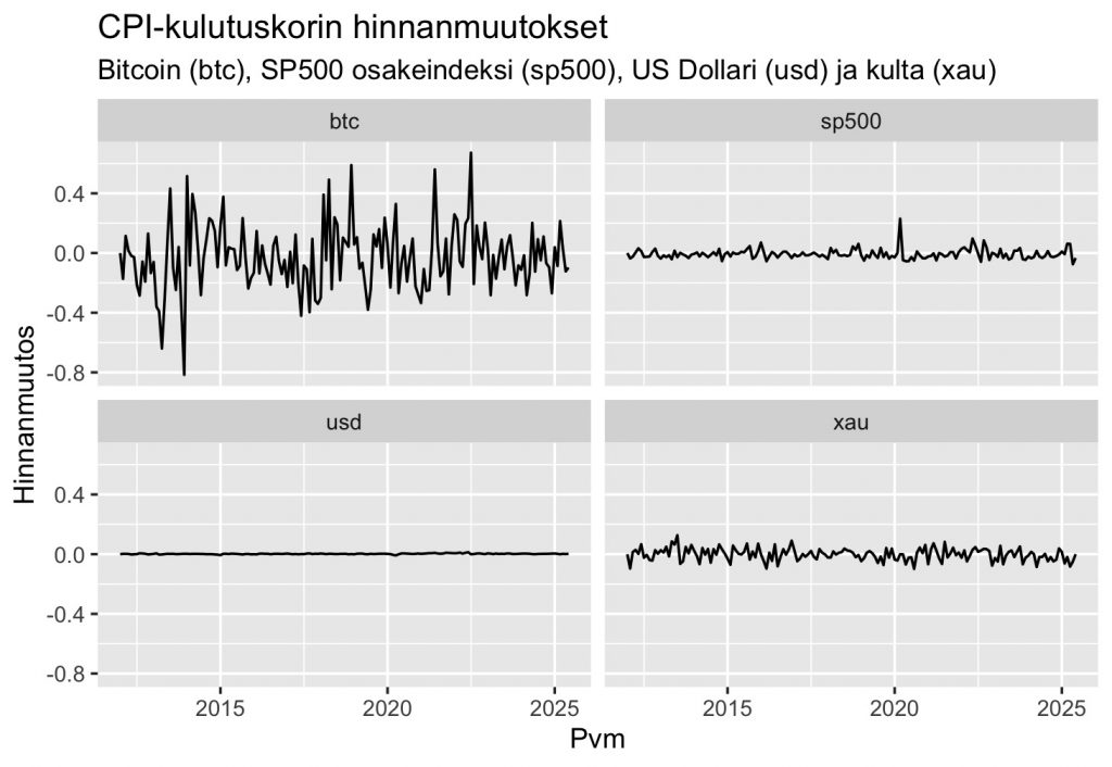 Arvon vaihtelun havainnollistamiseksi keräsin ”www.kaggle.com/datasets” -sivustolta bitcoinin, kullan, USA:n dollarin ja CPI-kulutuskorin (yleinen inflaatiomittari) kuukausittaista hinnoista ja näiden datasettien yhteinen historia käsittää ajanjakson tammikuu 2012 – kesäkuu 2025. Kuvaajassa nähdään kuinka kulutuskorin hinta on suhteellisesti heilunut näihin kilpaileviin rahoihin nähden. Vertailun vuoksi otin kuvaajan myös kuinka paljon CPI-kulutuskori on heilahdellut USA:n osakeindeksiin (SP500) peilaten. Kuvaajasta nähdään, että bitcoinina mitaten arvo on heilunut ylivoimaisesti eniten, dollareina ylivoimaisesti vähiten ja osakeindeksinä sekä kultana sillä välillä.