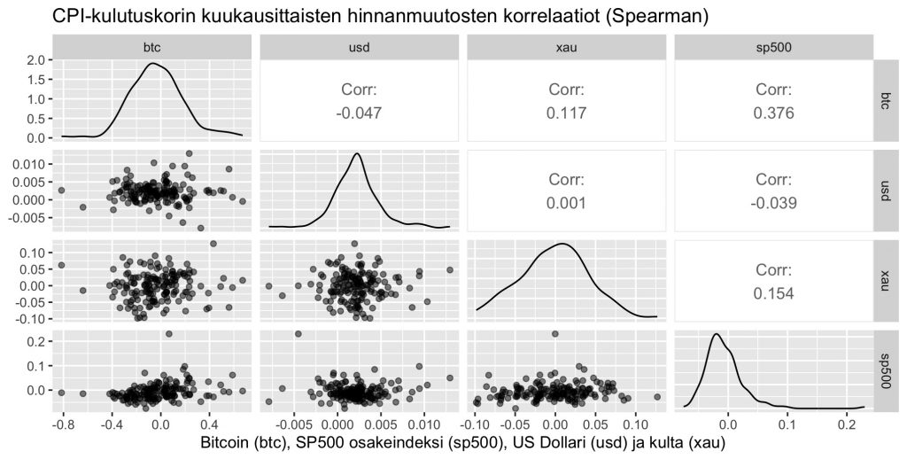 Rahaa voi toki käyttää osana sijoitussalkun riskien hallintaan. Bitcoin on kuitenkin niin volatiili ja dataa korrelaatioista muiden omaisuusluokkien (mitä pienempi, sitä parempi hajautushyöty) kanssa niin vähän olemassa, että suhtautuisin siihenkin vielä varauksella. Alla olevassa kuvaajassa on aiempaan dataan pohjautuen näiden omaisuusluokkien kuukausittaisten hintavaihtelujen parittaiset sirontakuvaajat ja lasketut korrelaatiokertoimet (Spearmanin versio). Tällä ajanjaksolla bitcoinin ja osakemarkkinan korrelaatio on ollut positiivinen 0.376.